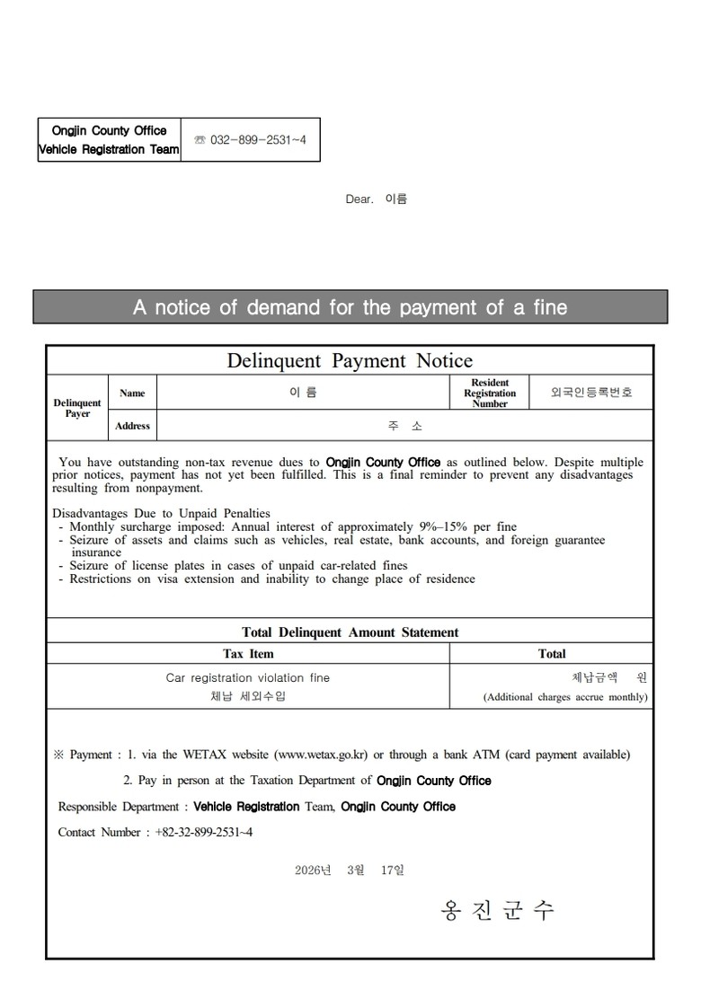 [옹진군 세계타임즈=심하린 기자] 옹진군(군수 문경복)이 자동차 과태료 외국인 체납자들을 대상으로, 영어로 번역된‘자동차 과태료 체납 안내문’을 발송한다고 밝혔다.