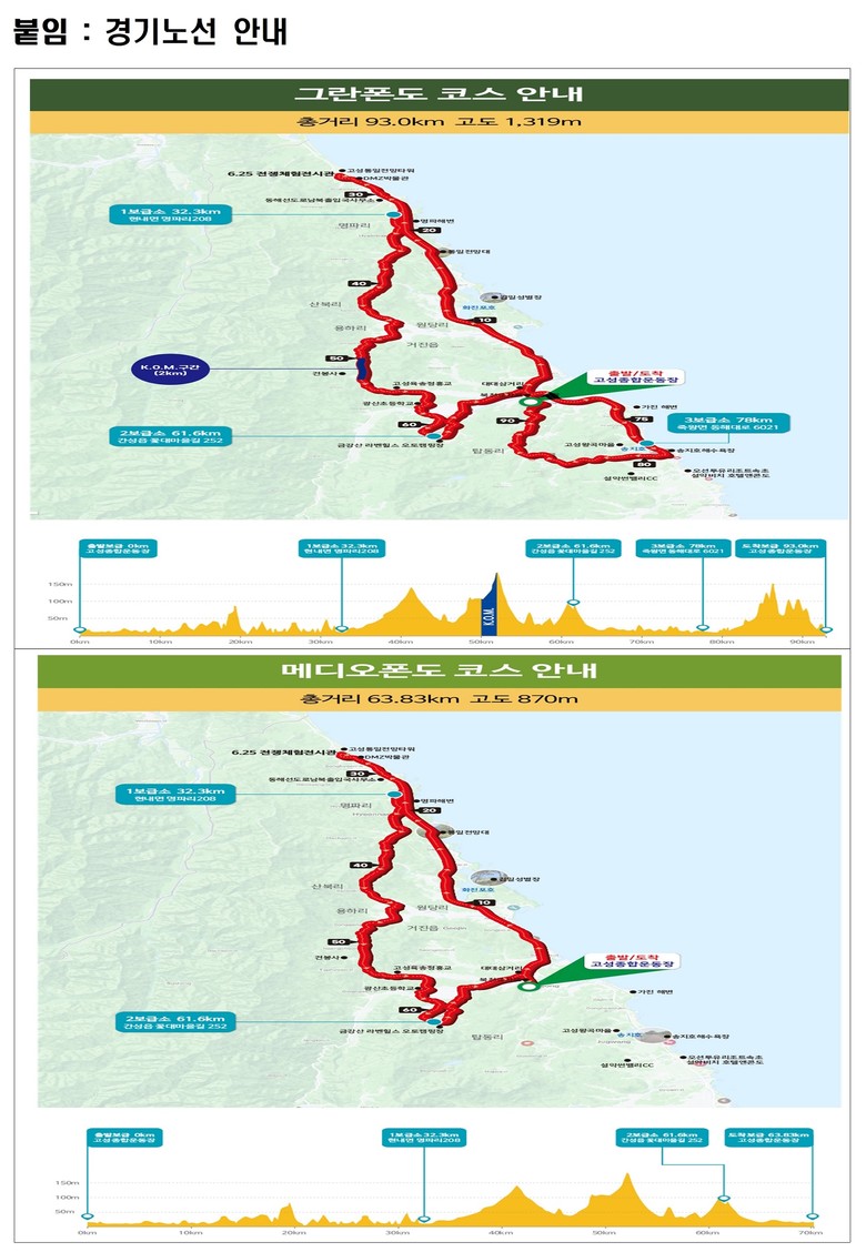 이번 대회에는 전국에서 총 1,011명의 자전거 동호인이 참가하며, 고성종합운동장을 출발해 통일전망대, DMZ박물관, 건봉사, 백두대간생태전시관, 송지호전망타워를 잇는 93km 그란폰도 코스와 63.83km 메디오폰도 코스 두 종목으로 진행된다.