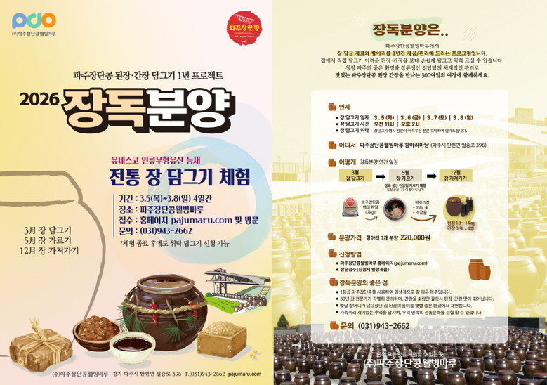 장독분양 신청 및 파주장단콩웰빙마루 이용과 관련한 자세한 사항은 ㈜파주장단콩웰빙마루(☎031-943-2662)로 문의하면 된다.