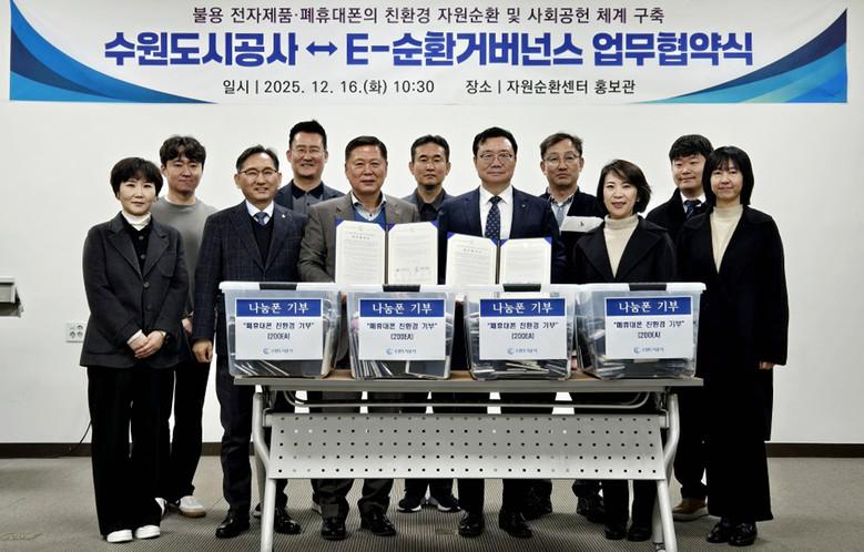 | ▲16일 오전 수원시자원순환센터에서 열린 ‘공사·E-순환거버넌스 친환경 자원순환 및 사회 공헌 체계 구축을 위한 협약식’에서 두 기관 관계자가 기념 촬영을 하고 있다.(사진=수원도시공사) |