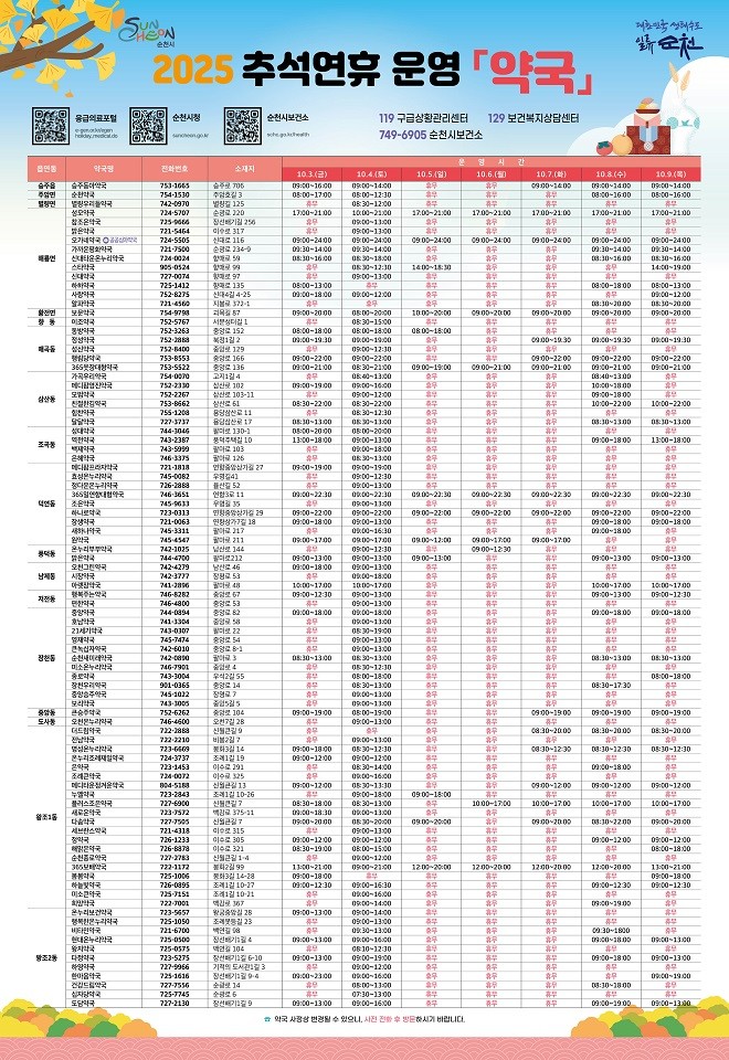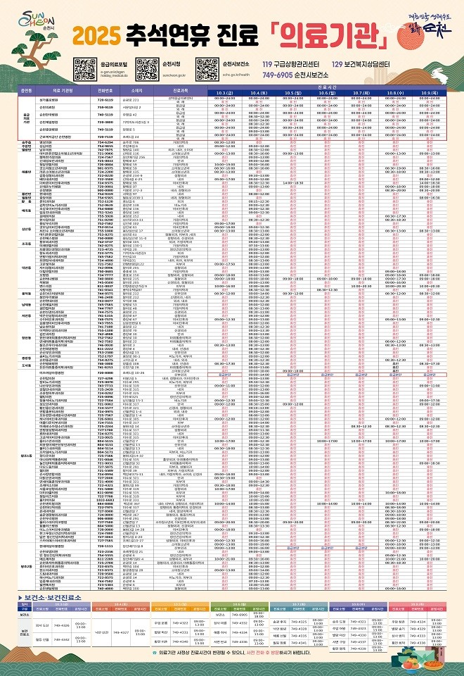 연휴 중 문을 여는 병·의원 및 약국 정보는 순천시·순천시보건소 누리집, 응급의료포털 E-gen에서 확인 가능하며, 인터넷 사용이 어려운 경우에는 보건소 응급진료 상황실(061-749-6905)로 문의하면 된다.