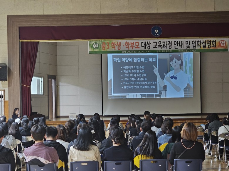 [시흥시 세계타임즈=송민수 기자] 서해고등학교(교장 이재선)는 지난 12일 250여명의 학생과 학부모님들이 참여한‘중3 학생 학부모 대상 교육과정 안내 및 입학설명회’를 성황리에 마쳤다. 설명회장을 빼곡이 채울 정도로 많은 학생과 학부모님들이 참석하여, 서해고의 교육과정과 소중한 정보를 공유하는 시간을 가졌다.