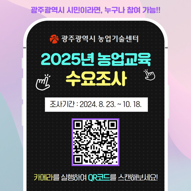 이번 수요조사는 온라인과 현장 방문으로 진행된다. 온라인 조사는 광주농업기술센터 인스타그램, 블로그 등 사회관계망서비스(SNS)와 광주농업기술센터 누리집(https://www.gwangju.go.kr/agri/) 팝업창 정보무늬(QR코드)를 통해 의견을 제시하면 된다. 인터넷 활용이 어려운 고령 농업인들에 대한 수요는 농업기술센터, 농업인상담소 직원이 방문해 조사한다.