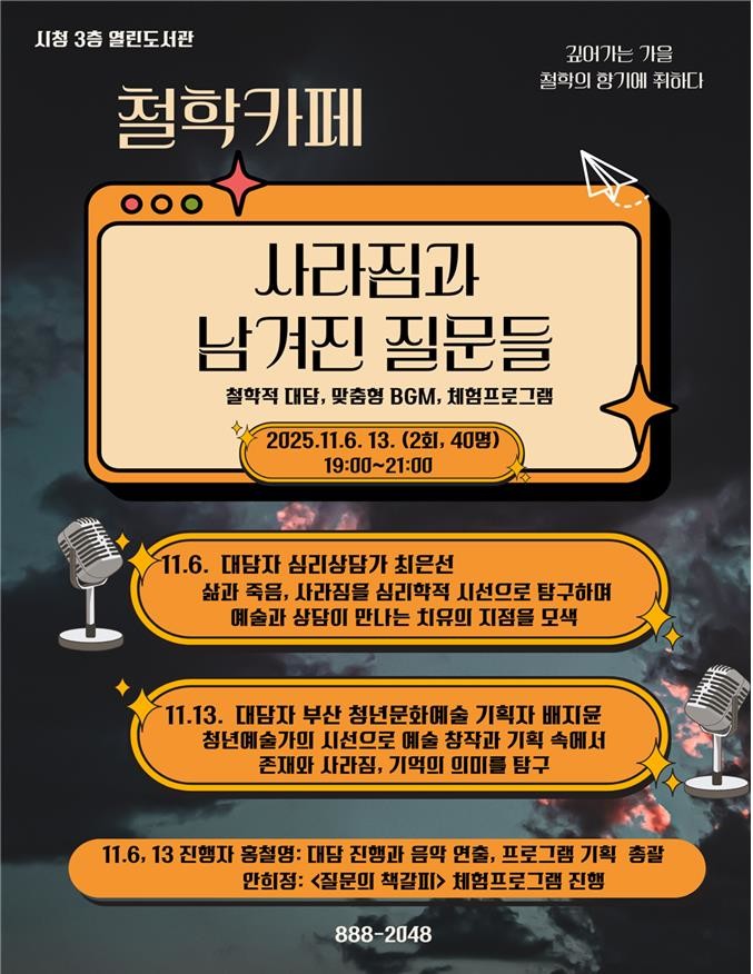 한편, 시청 3층 열린도서관에서는 오늘(6일)과 11월 13일 오후 7시, 성인을 대상으로 한 「철학 카페: 사라짐과 남겨진 질문들」을 마련했다.