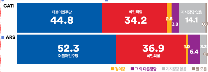 같은 기간 진행한 ARS조사 결과, ’더불어민주당’은 지난 주보다 5.0%p 상승한 52.3%, ‘국민의힘’은 0.9%p 하락한 36.9%로 양당 간 격차는 15.4%p로 조사되었다. ‘더불어민주당’은 대구·경북지역에서 22.5%p 크게 하락했으나 그 외 지역에서 모두 오르며 다시 50%대로 지지율을 끌어올렸고, ‘국민의힘’은 대구·경북, 강원·제주와 서울에서 올랐으나 그 외 지역에서 모두 하락했다.