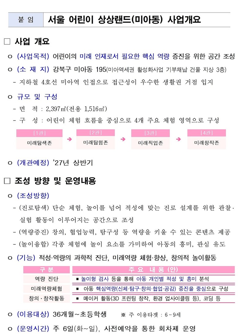 특히, ‘서울 어린이 상상랜드’ 인근에 있는 키즈카페(4개소), 우리동네 키움센터(3개소) 등 지역 내 아동시설들과 연계해서 강북권의 어린이 체험.돌봄 생태계를 형성하는 거점시설로 기능을 할 것으로 기대된다.