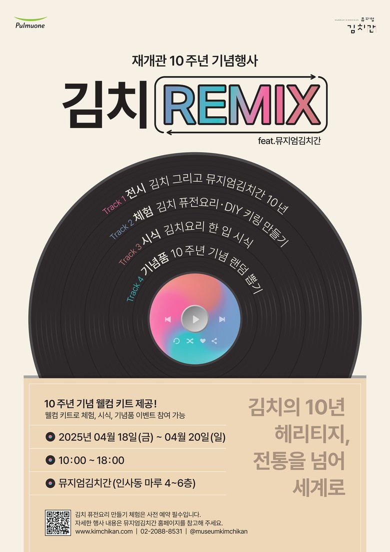 [세계타임즈 = 이현진 기자] 한국의 김치와 김장 문화를 보존하고 발전시켜 온 풀무원 뮤지엄김치간이 재개관 10주년을 맞아 오는 18일부터 20일까지 재개관 10주년 기념행사 ‘김치 REMIX (feat. 뮤지엄김치간)’를 진행한다고 13일 밝혔다.