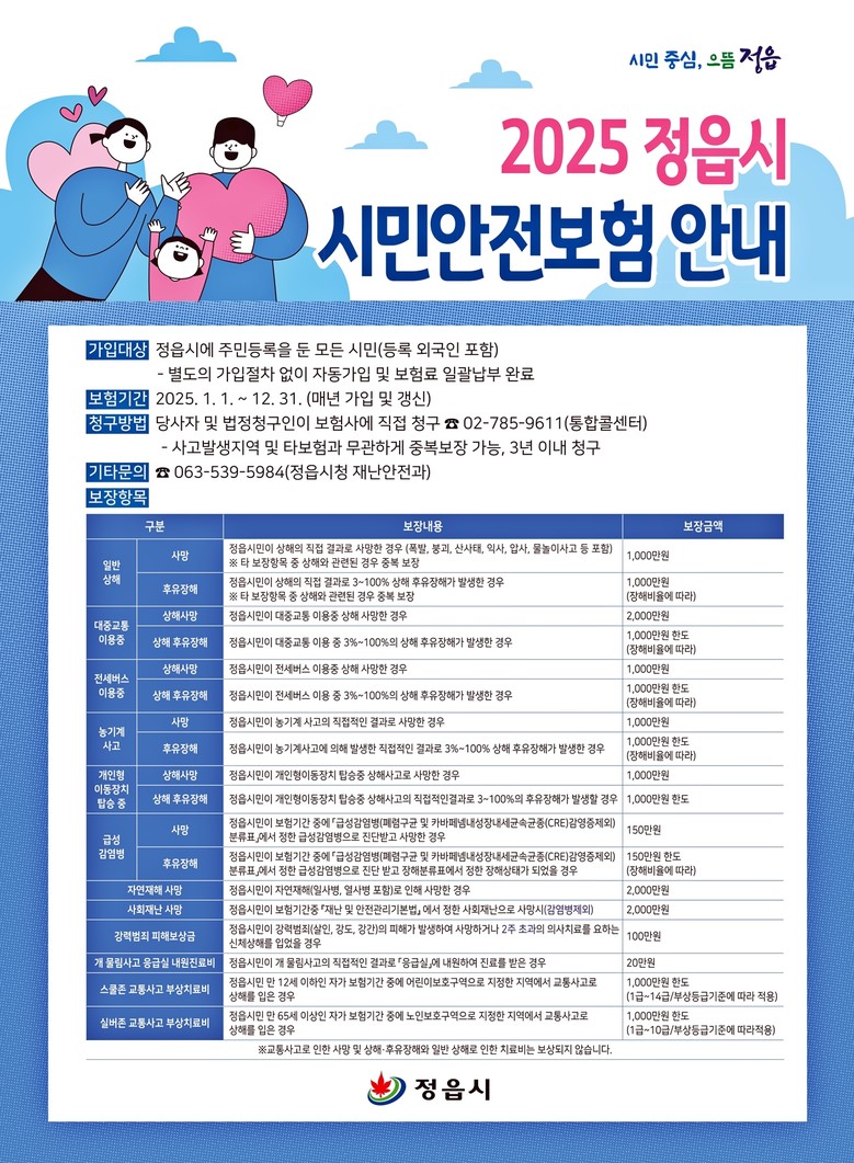 먼저 시민안전보험은 정읍시에 주민등록을 둔 모든 시민이 별도 절차 없이 자동 가입된다. 상해, 감염병, 대중교통 이용 중 사고, 농기계 사고, 전세버스 이용 중 사고 등으로 인한 사망·후유장해는 물론, 자연재해나 사회재난으로 인한 사망, 개물림 사고 응급실 진료비, 강력범죄 피해보상금 등 총 18개 항목에 대해 최소 100만원에서 최대 2000만원까지 보장한다. 다른 지역에서 발생한 사고도 보장되며 사고 발생일로부터 3년 이내에 청구할 수 있고 타 보험과 중복 보장도 가능하다. 단, 대법원 판례에 따라 만 15세 미만 시민의 사망은 보장에서 제외된다.