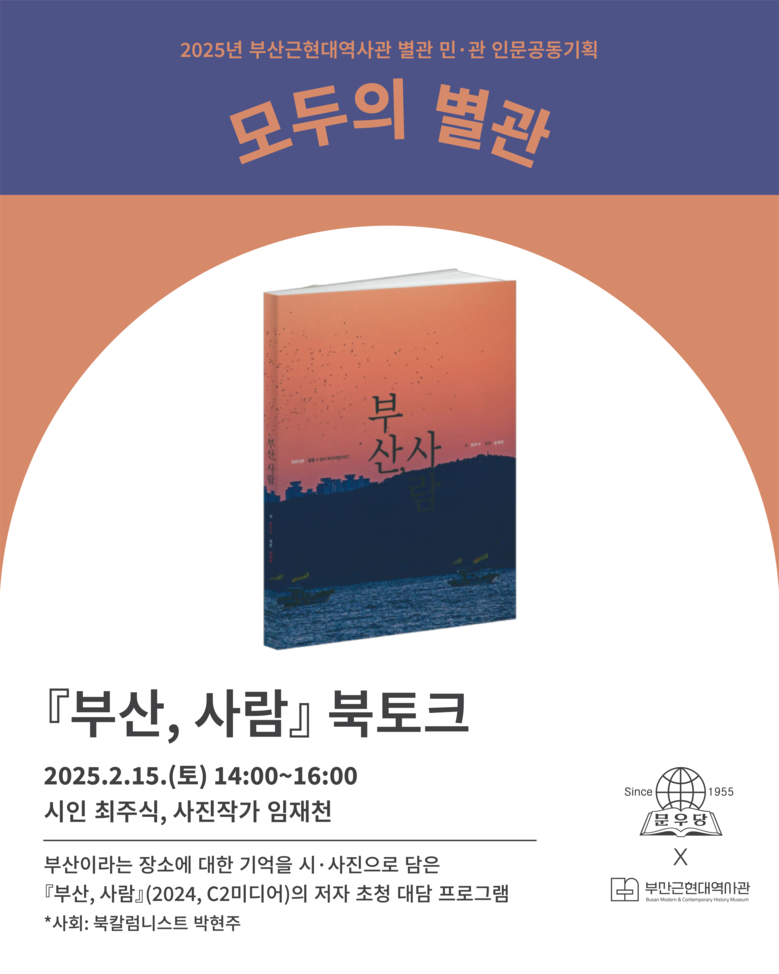 이날 행사에서는 부산이라는 장소에 대한 기억을 시·사진으로 담은 책 『부산, 사람』(2024, C2미디어)을 대담(북토크)의 형식으로 소개한다. 대담에는 해당 콘텐츠의 저자인 시인 최주식과 사진작가 임재천이 출연한다. 사회는 박현주 북칼럼니스트가 맡는다.