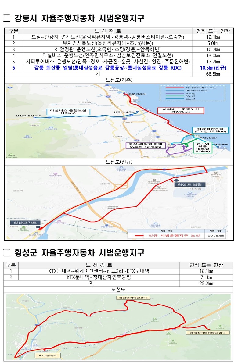 강릉시는 기존 5개 노선 58km 구간에 화물차 자율주행 실증 구간 10.5km가 추가 지정돼 총 68.5km 구간에서 시범운행을 실시하게 되며, 횡성군은 둔내면 스마트 생태관광 셔틀 차량 운영을 위한 2개 노선 25.2km 구간을 새롭게 지정받아 운영할 예정이다.