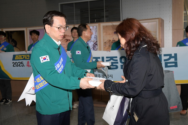 [광주 세계타임즈=손권일 기자] 고광완 광주광역시 행정부시장이 14일 오전 시청 1층 출입구에서 출근하는 시 공직자를 대상으로 집중안전점검 캠페인을 하고 있다. /광주광역시 제공