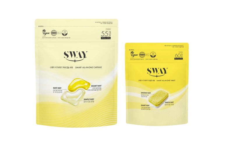 SWAY는 스마트 파워 성분을 함유해 찌든 기름기부터 다양한 양념이 묻은 식기 등을 깨끗하게 세척해 준다. 또한 식기의 세정을 도와주는 세제와 건조를 도와주는 린스 성분을 한 번에 담은 ‘올인원’(All-in-one) 제품으로 사용의 편리성을 더했다.