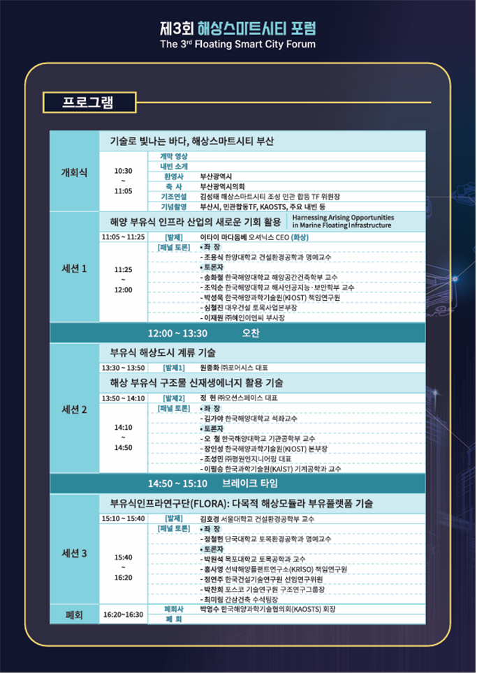 이날 토론회(포럼)는 해상스마트시티 분야 전문가와 관계자 등 150여 명이 참석한 가운데 '해상스마트시티 실현을 위한 핵심 기술 및 연구 성과'를 주제로 개회식, 3개 분과(세션)별 발표 및 토론 등으로 진행된다.