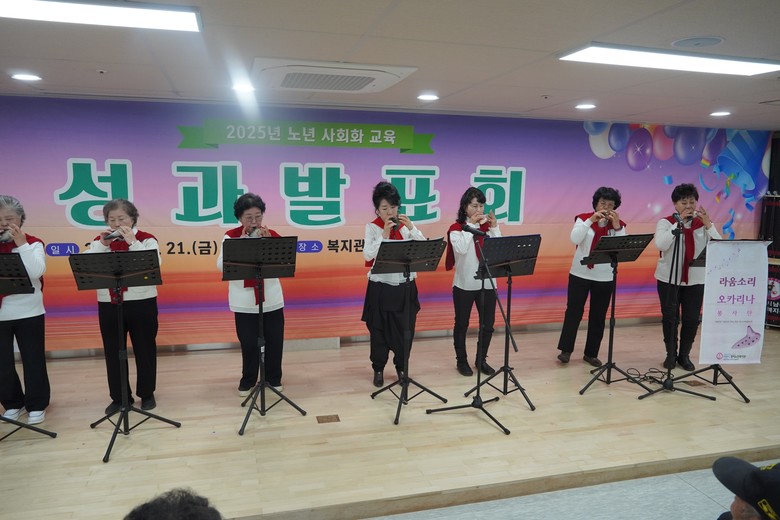지난 11월 19일에는 ‘2025년 어르신 인생노트 2기 수료식’, 20일에는 ‘치매 예방프로그램 두뇌 튼튼 수료식’을 진행한 데 이어, 21일에는 복지관 1층 대강당에서 ‘2025년 노년 사회화 교육 성과 발표회’를 열어 어르신들의 다양한 성과를 무대와 전시로 선보였다.
