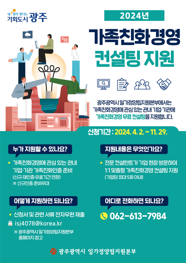 참여를 원하는 기업과 기관은 광주시 누리집 고시·공고 또는 광주일가정양립지원본부 누리집 새소식에서 신청서를 내려받아 작성한 후 전자우편(isj4078@korea.kr)으로 신청하면 된다.
