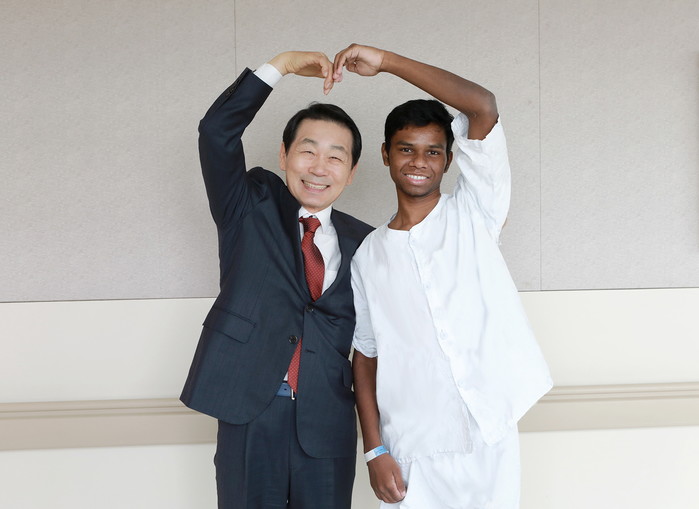 | ▲자생의료재단 박병모 이사장(왼쪽)과 방글라데시 청년 피터가 사진 촬영을 하고 있다. |