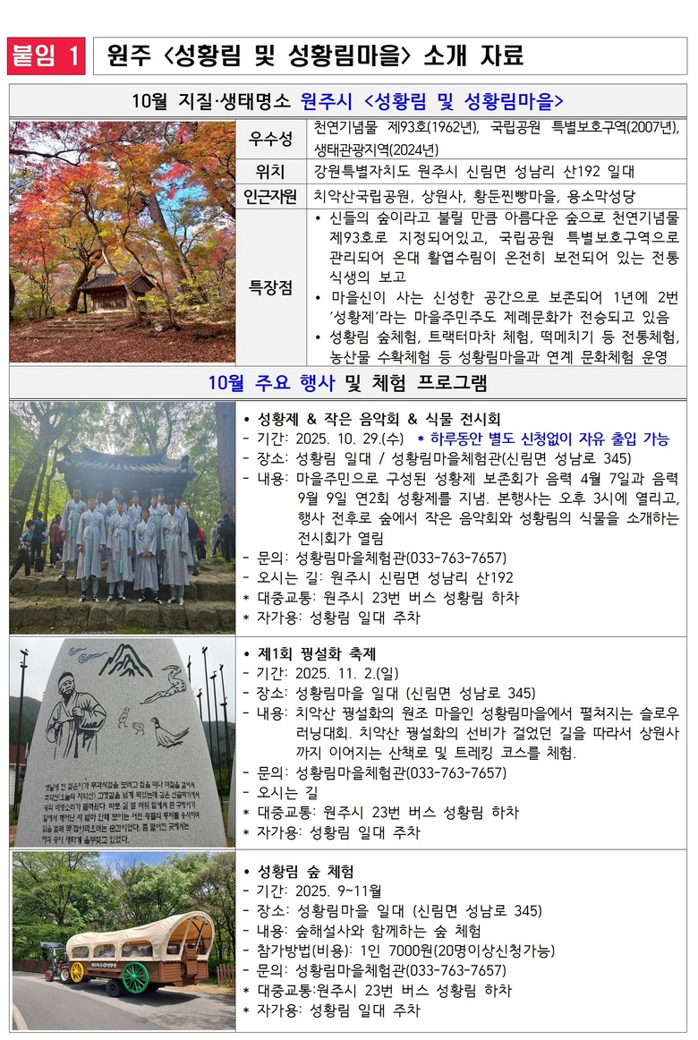 ▶ 전통 제례문화와 생태관광이 어우러진 원주 가을 여행지! [강원도 세계타임즈=김민석 기자] 강원특별자치도(도지사 김진태)는 2025년 10월의 ‘지질·생태명소’로 원주시의 <성황림 및 성황림마을>을 선정했다고 밝혔다.