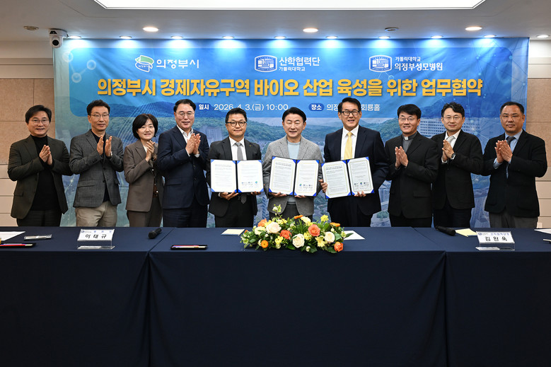 [의정부시 세계타임즈=송민수 기자] 의정부시는 4월 3일 시청 회룡홀에서 가톨릭대학교 의정부성모병원, 가톨릭대학교 산학협력단과 함께 ‘의정부시 경제자유구역 바이오 산업 육성을 위한 업무협약’을 체결했다.