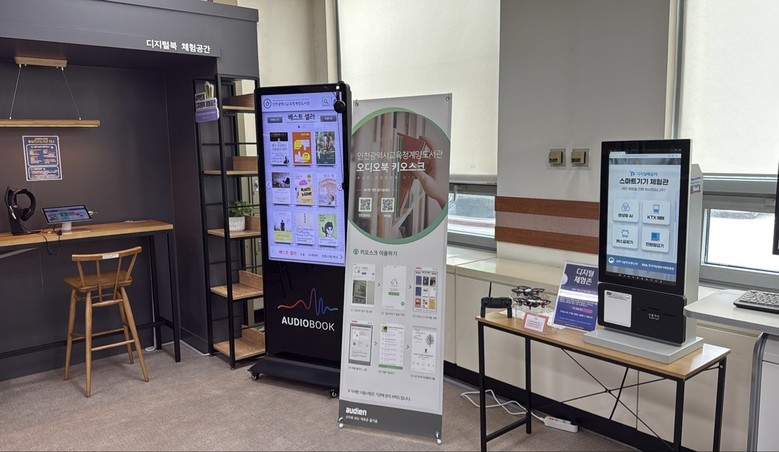 디지털북(태블릿PC)으로는 통합전자도서관에 접속해 전자책, 자격증 VOD 등 다양한 디지털 콘텐츠를 이용할 수 있고, 오디오북 키오스크를 통해서는 책을 귀로 들으며 즐길 수 있다.