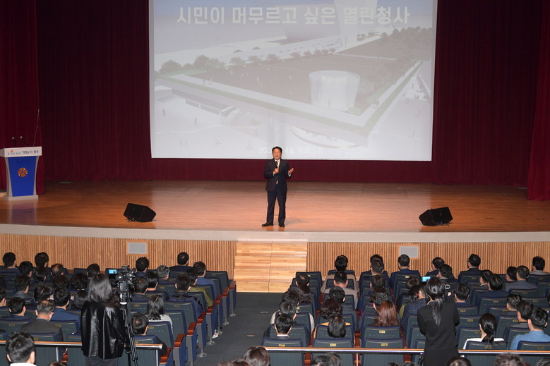이날 정례조회에서 김광태 주무관(회계과)은 치평동 청사 개청 20주년을 맞아 ‘시민이 머물고 싶은 열린청사’를 주제로 발표했다.