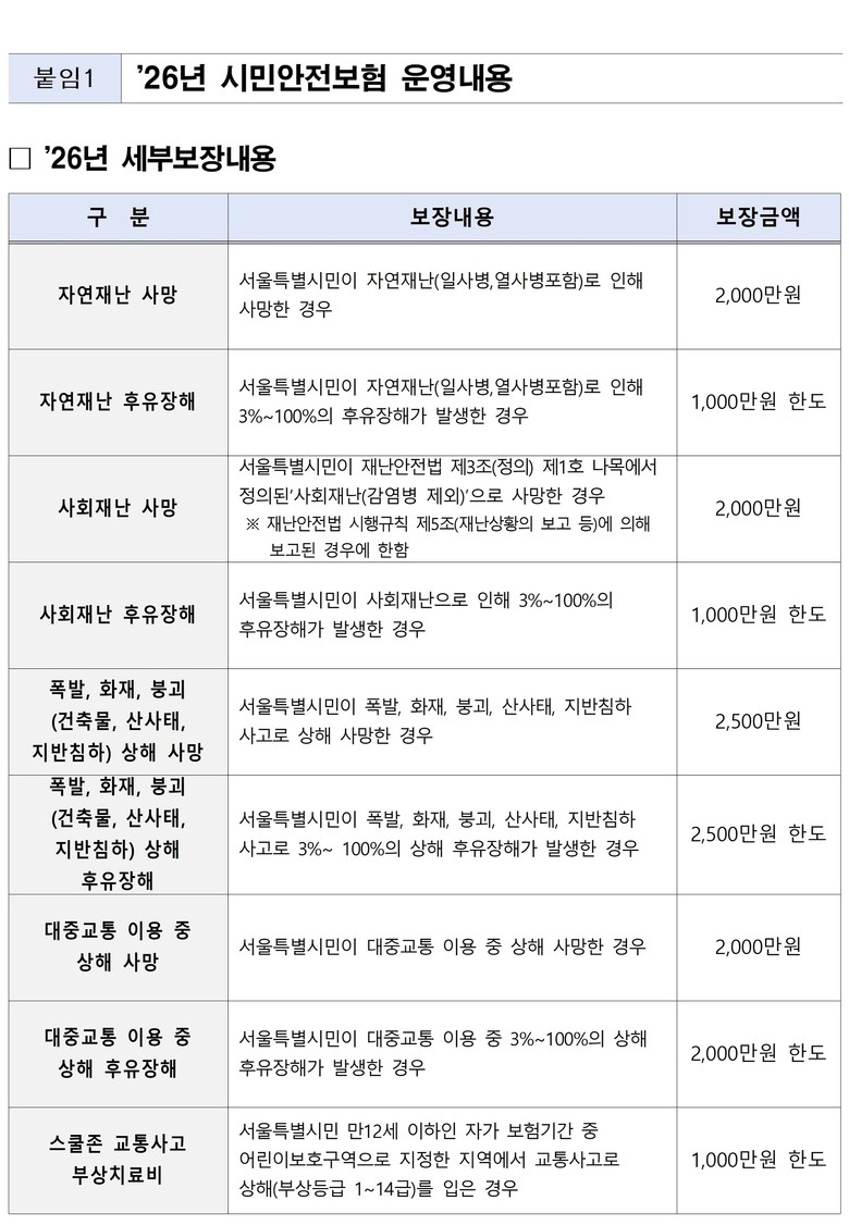 - 서울 시민 누구나 자동 가입, 사고 발생‧후유장해 진단일로부터 3년 이내 신청 가능