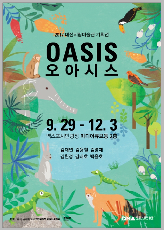 어린이미술기획전 ‘오아시스’는 6인의 작가 김재연, 김영재, 김용철, 김원정, 김태호, 백윤호가 참여해 엑스포시민광장 주변을 소재로‘생명, 생태, 자연, 환경, 동물 그리고 자연과 공존하는 우리 자신, 자연과 사람과의 관계’에 대해 조명해보는 전시이다.