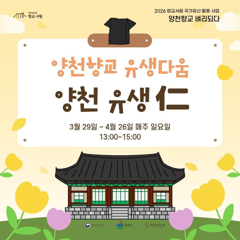 전통 교육기관 가치 계승과 기후 위기 대응 교육 등 다채로운 구성 [강서구 세계타임즈=이장성 기자] 서울 강서구(구청장 진교훈)는 서울 유일의 향교인 양천향교에서 3월부터 11월까지 ‘2026년 향교·서원 국가 유산 활용사업’을 진행한다.