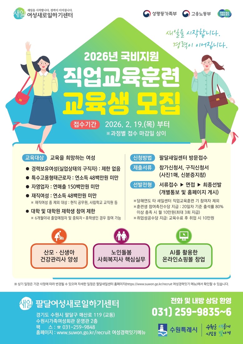 신청을 희망하는 여성은 신분증을 지참해 팔달여성새로일하기센터(팔달구 매산로 119, 수원시가족여성회관 운영관 2층)로 방문 신청해야 한다.