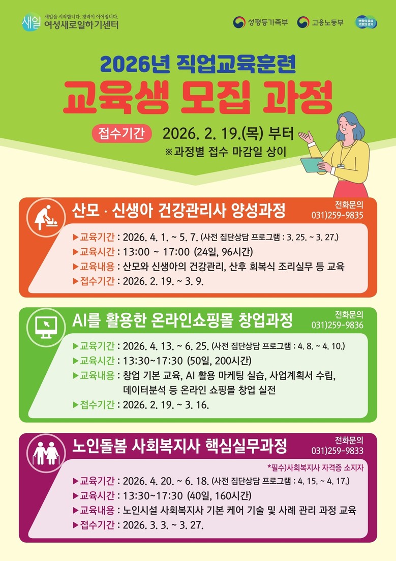 모집 과정은 ▲산모·신생아 건강관리사 양성(4월 1일~5월 7일) ▲인공지능(AI)을 활용한 온라인 쇼핑몰 창업(4월 13일~6월 25일) ▲노인돌봄 사회복지사 핵심실무(4월 20일~6월 18일) 등 3개 과정으로 각 20명을 선발한다. 교육 전 3일간 집단상담 프로그램도 연계 운영한다.