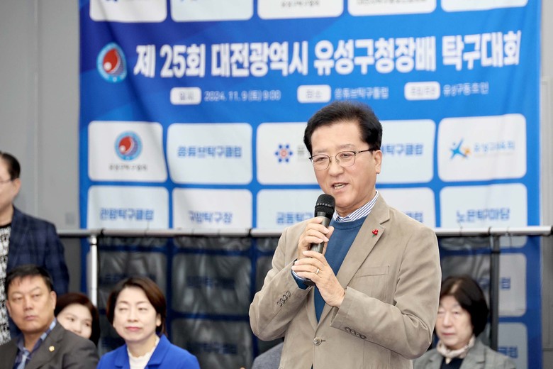 [대전 세계타임즈=이채봉 기자] 대전시의회 조원휘 의장은 9일 유성구 소재 씅튜브탁구클럽에서 열린 ‘제25회 유성구청장배 탁구대회’를 찾아 “갈고닦은 기량을 마음껏 뽐내면서 탁구 기술과 전략을 한 단계 더 발전시키는 뜻깊고 소중한 시간 되시길 바란다”며 대회 개최를 축하했다.