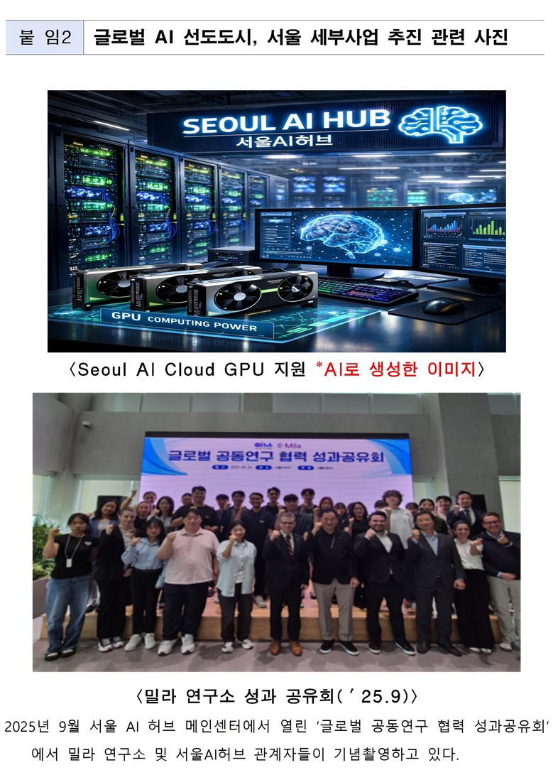 글로벌 연구기관과의 공동연구도 병행되고 있다. 지난 2023년부터 캐나다 밀라 AI 연구소와 서울AI허브 입주기업(’24년 7개사, ’25년 7개사) 간의 AI 스타트업 공동연구 프로그램을 추진하며, 해외 연구 성과가 서울 기업의 기술 고도화로 이어지는 구조를 만들어 가고 있다.