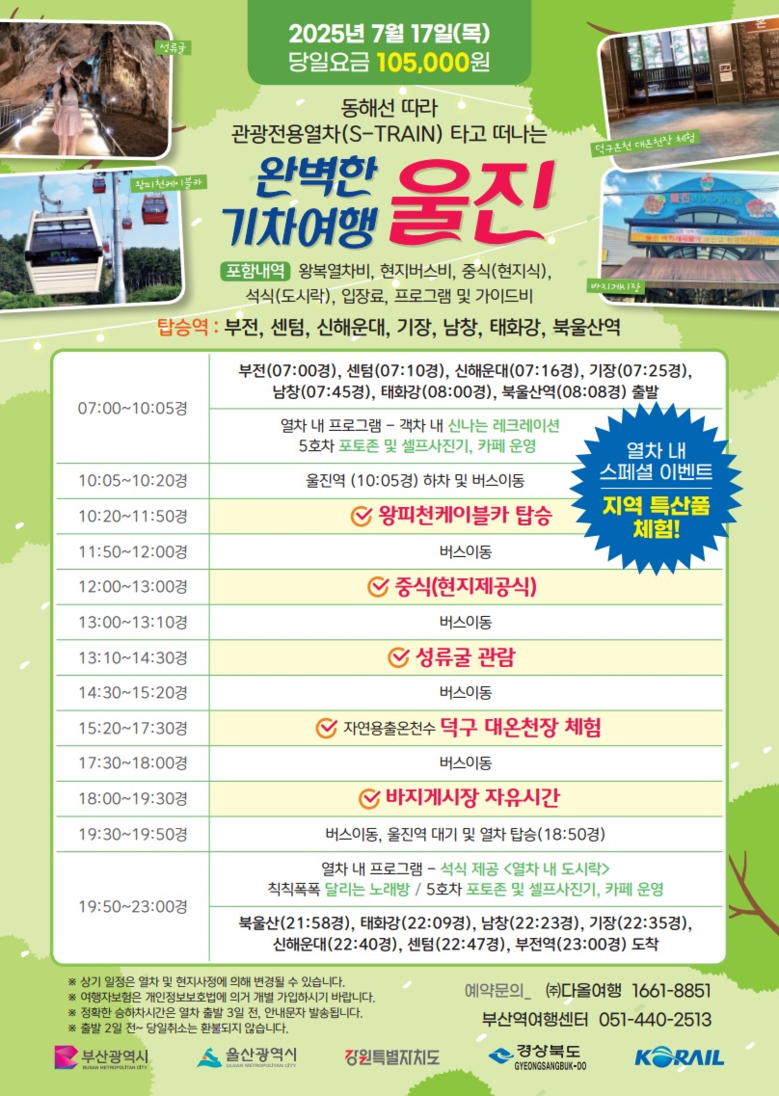 ‣ 부산역 여행센터: ☎ 051-440-2513 ‣ ㈜ENTS 여행사: ☎ 1611-8851 ※ 운영시간: 평일 09:00~18:00 ‣ 네이버 스마트스토어 : https://smartstore.naver.com/etrain999 |