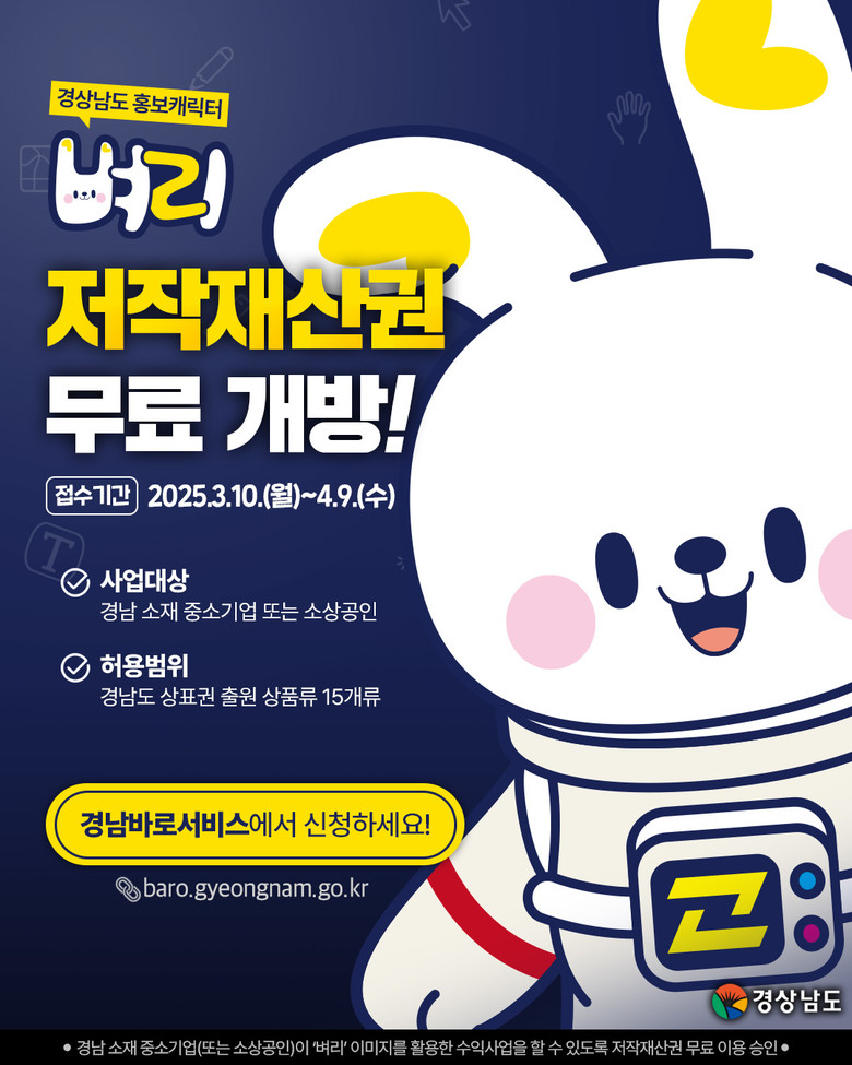 ‘벼리’ 저작재산권 개방 신청은 상‧하반기로 나눠 진행된다. 2025년 상반기 신청 기간은 3월 10일부터 4월 9일까지다. 도내 중소기업 및 소상공인은 해당 기간 동안 신청서, 확약서, 사용계획서 등 총 6종의 서류를 ‘경남바로서비스’(https://baro.gyeongnam.go.kr)를 통해 제출하면 된다. ‘경남바로서비스’는 도의 지원정책을 온라인에서 간편하게 신청할 수 있는 서비스다.