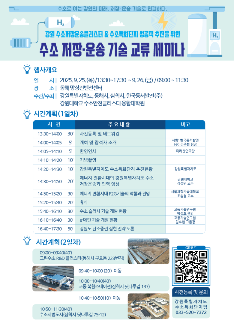 - 탄소중립 실현 전략 및 미래 사업모델 모색 [강원도 세계타임즈=김민석 기자] 강원특별자치도(도지사 김진태)는 9월 25일부터 26일까지 동해 망상컨벤션센터와 동해·삼척 일원에서 「수소 저장·운송 기술 교류 세미나」를 개최한다고 밝혔다.