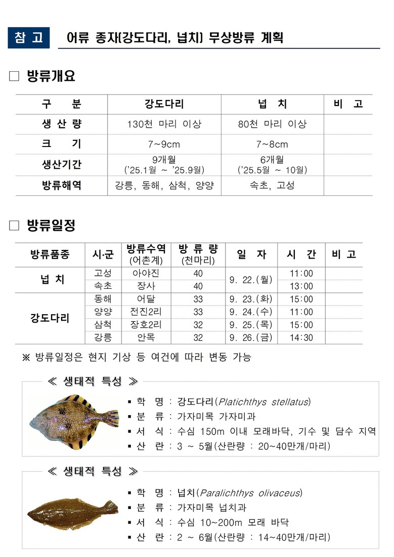 방류 대상은 강도다리 13만 마리와 넙치 8만 마리로, 모두 지역 특성에 적합한 고부가가치 품종이다. 방류 지역은 강릉시, 동해시, 속초시, 삼척시, 고성군, 양양군 등 동해안 주요 마을어장 인근 해역이다.