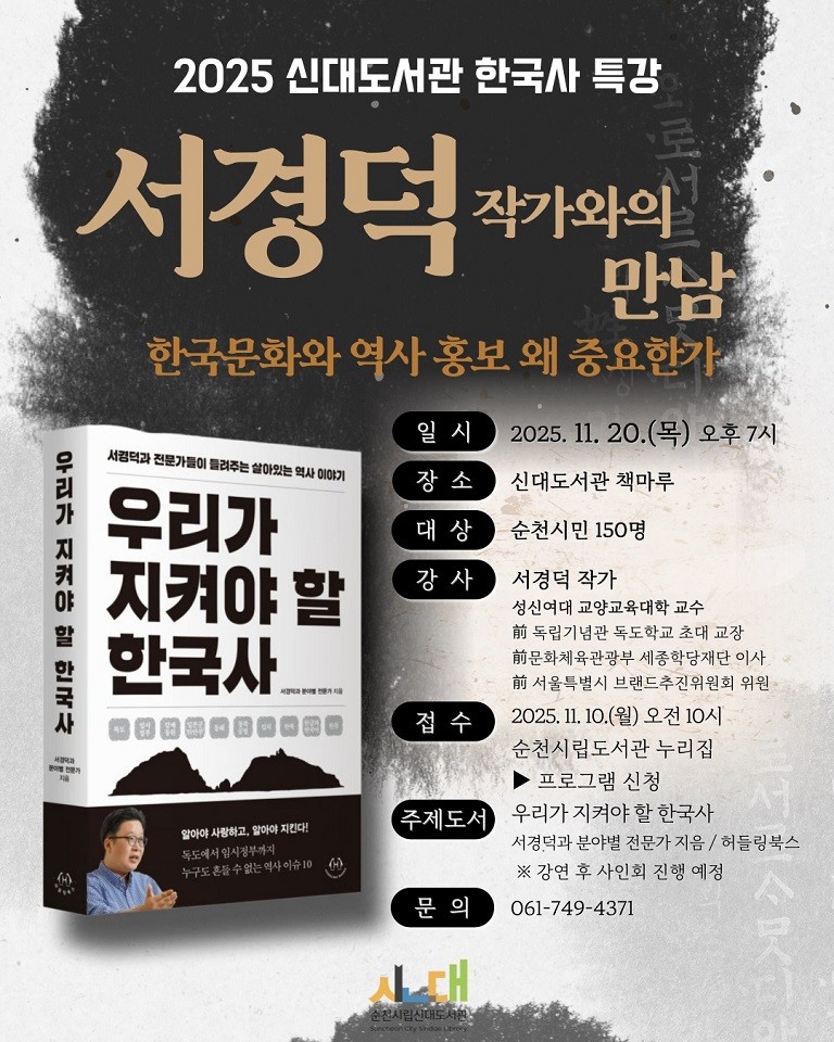 이번 강연은 순천시립도서관 누리집을 통해 사전 신청할 수 있으며, 자세한 사항은 신대도서관(061-749-4371)으로 문의하면 된다.