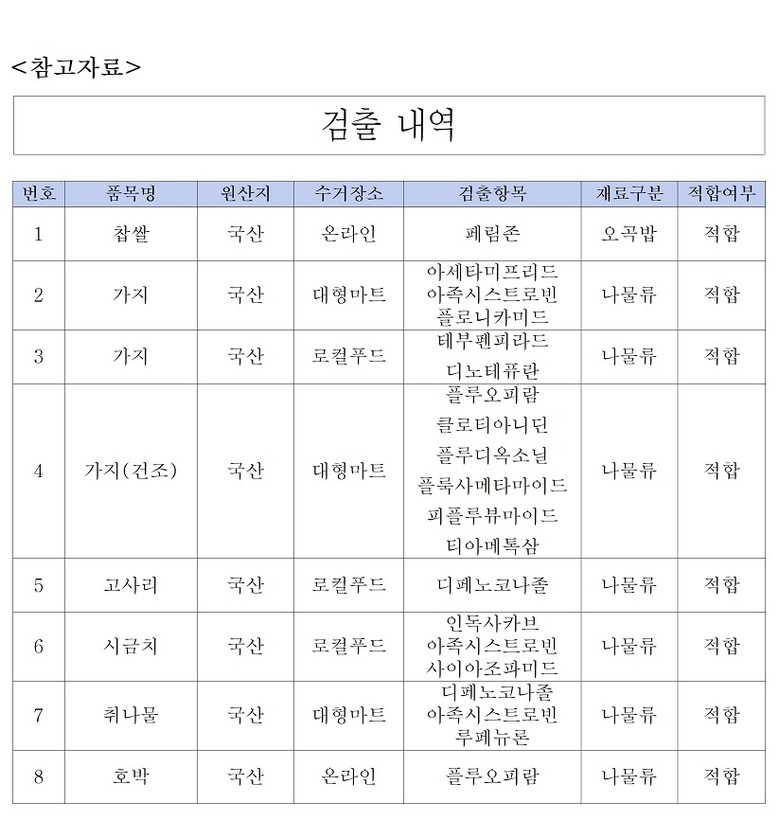 검사 대상은 온라인 판매 농산물 45건과 도내 로컬푸드 직매장·대형마트 유통 농산물 68건 총 113건이다. 오곡밥 재료인 기장·수수·조·찹쌀·콩·팥 등 40건, 나물 재료인 가지·고사리·도라지·무·취나물·호박 등 52건, 부럼류인 땅콩·밤·은행·잣·호두 등 21건을 포함했다.
