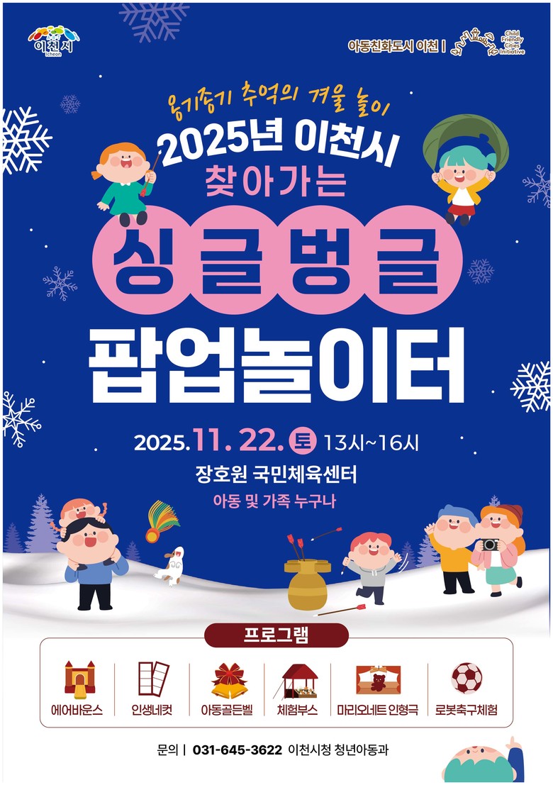 『찾아가는 싱글벙글 팝업 놀이터』는 계절별 콘셉트로 진행되는 가족 참여형 놀이문화 프로그램으로, 올해 총 3회로 개최된다. 지난 8월 1회차 ‘이천 CITY 바캉스’는 여름 물놀이로 성황리에 마무리되었으며, 9월에 개최된 2회차 ‘가을소풍’ 온 가족이 함께 참여하는 가을소풍 콘셉트로 높은 호응을 얻었다.