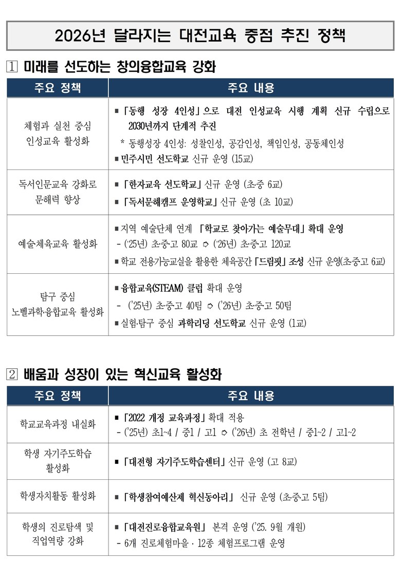 설동호 대전광역시교육감은 “교육은 인재를 만들고, 인재가 새로운 미래를 만든다.”고 전하며, “2026년에도 대전교육은 꾸준한 변화와 혁신으로 우리 학생들이 미래를 이끌어갈 창의융합인재로 성장할 수 있도록『행복한 학교, 미래를 여는 대전교육』을 실현하겠다.”고 밝혔다.