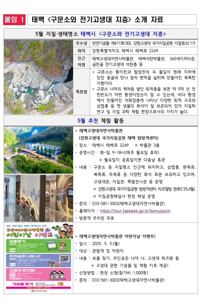 특히 5월 5일 어린이날을 맞아 구문소 인근 ‘태백고생대자연사박물관’에서는 어린이와 가족을 위한 특별 체험 이벤트가 운영된다.