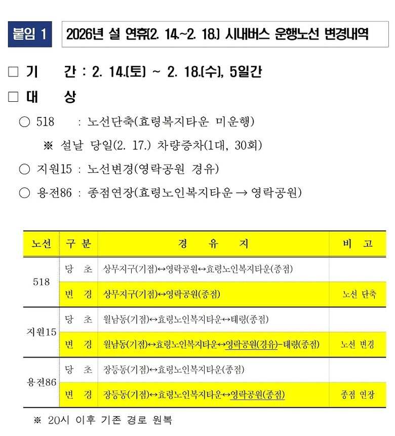 -설 당일 성묘객 편의 518번 증차…지원15·용전86 영락공원 운행