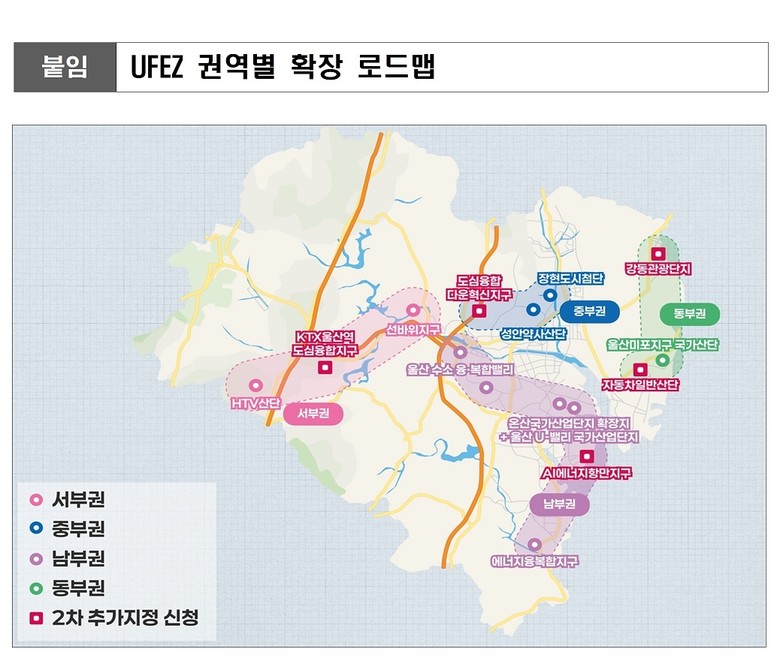 2차 추가지정 후보지는 ▲케이티엑스(KTX)울산역 도심융합지구 ▲도심융합 다운혁신지구 ▲자동차일반산업단지 ▲인공지능(AI)·에너지 항만지구 ▲강동관광단지 등 5곳으로, 울산경제자유구역청은 연내 산업통상자원부에 추가 지정을 신청할 계획이다.