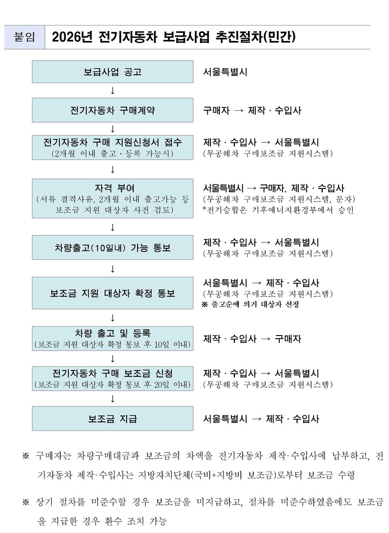 구매희망자는 자동차 제작·수입사와 계약을 체결하고, 제작·수입사가 서울시에 보조금을 신청하면 출고·등록 순으로 지원 대상자가 선정된다. 보조금은 차량 출고 및 등록 후 서울시가 제작·수입사에 직접 지급하며, 구매자는 보조금을 제외한 금액만 납부하면 된다.