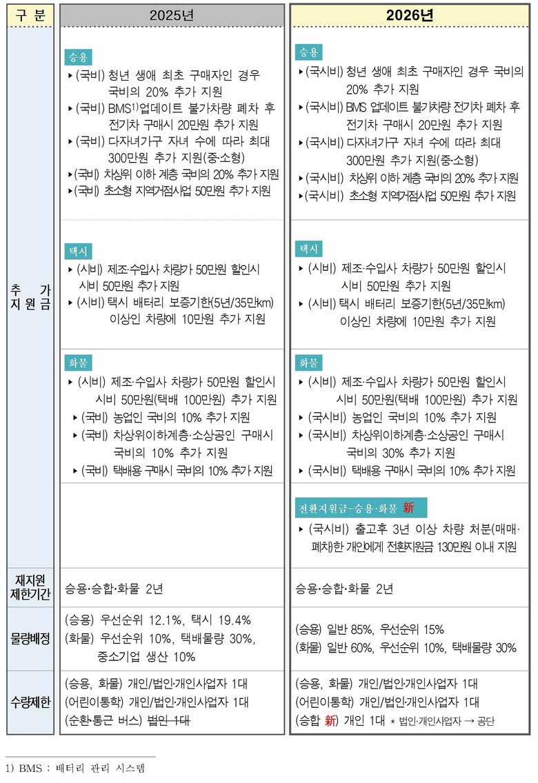 또한, 차상위 이하 계층과 청년 생애 최초 전기차 구매자에게는 국비 지원액의 20%를 추가 지원하고, 다자녀 가구는 자녀 수에 따라 최대 300만 원까지 추가 지원한다.