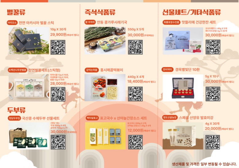 제품의 세부 정보와 구매처는 2월 2일부터 2월 18일까지 경상북도농업기술원 홈페이지 내‘지역특화 가공제품’페이지에서 확인할 수 있으며, QR코드를 스캔하면 판매처로 바로 연결돼 편리하게 구매할 수 있다.