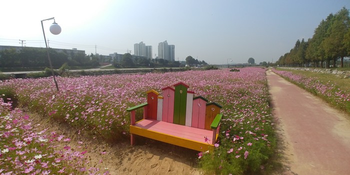 증평군은 인삼골축제(9.28~10.1.)를 찾는 관광객에게 아름다운 볼거리를 제공하기 위해 보강천변에 코스모스길을 조성했다.