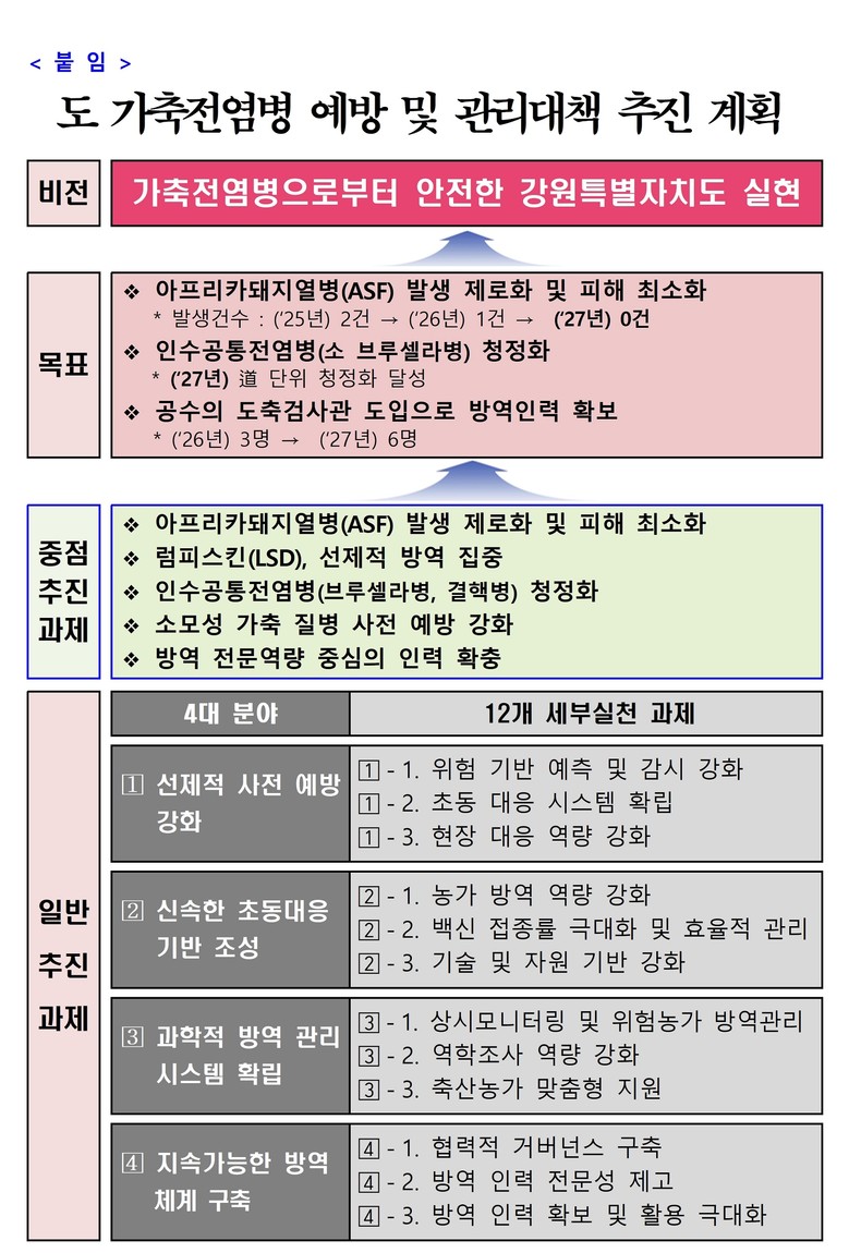 도는 이번 계획을 통해 향후 3년간 ▲아프리카돼지열병(ASF) 발생 제로화 ▲소 브루셀라병 도 단위 청정화 ▲방역 전문인력 확충 등 5대 중점 추진과제로 설정하고, 총 1,315억 원(국비 615억)을 투입해 17개 과제, 40여 개 세부사업을 단계적으로 추진할 계획이다.