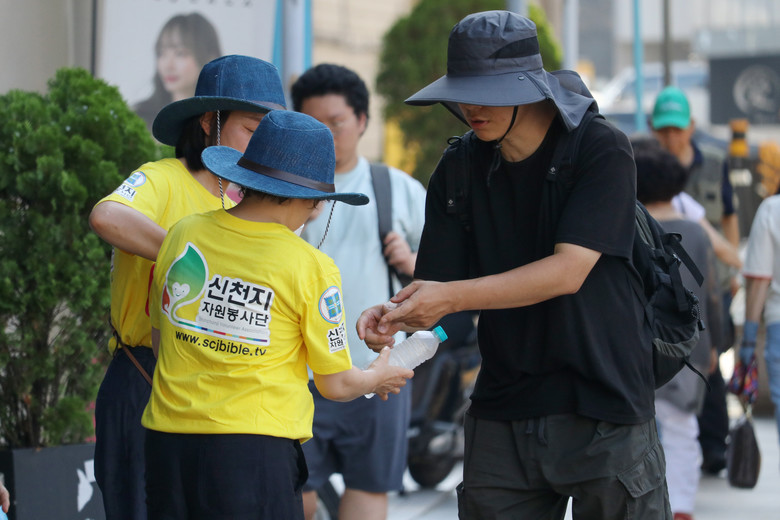 | ▲ 신천지자원봉사단 부천지부가 부천역 앞에서 시민들에게 시원한 생수를 나눠주고 있다. [사진 제공 = 신천지자원보앗단 부천지부] |