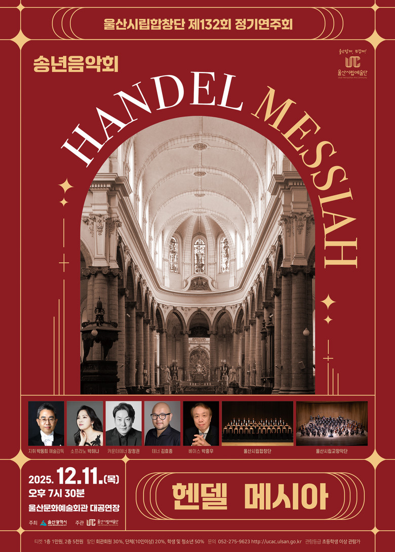 11일 오후 7시 30분에는 울산시립합창단 송년음악회 제132회 정기연주회 『헨델 메시아』가 대공연장에서 이어진다. 박동희 예술감독 지휘로 소프라노 박하나, 카운터테너 장정권, 테너 김효종, 베이스 박흥우가 출연하며, 반주는 울산시립교향악단이 함께 한다.