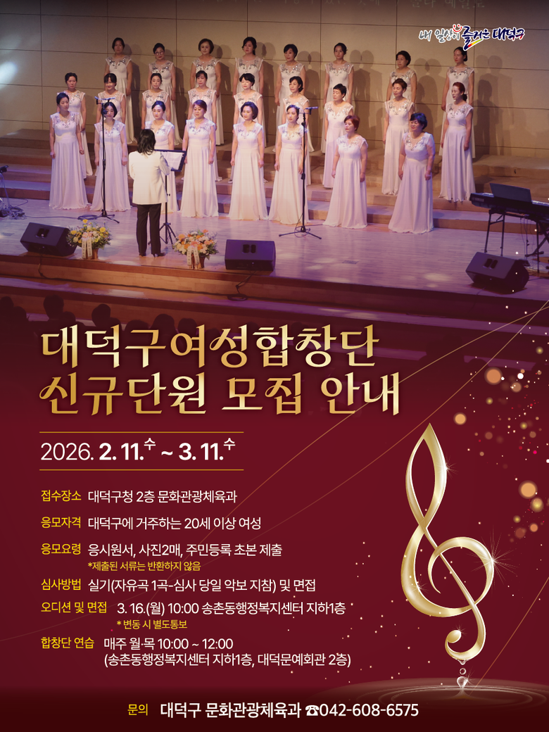 구는 3월 11일까지 ‘대덕구여성합창단’ 일반단원 15명 이내를 선발한다고 밝혔다. 지원 자격은 대덕구에 거주하는 20세 이상 여성으로, 성악 경험과 소질을 갖춘 주민이면 지원할 수 있다.